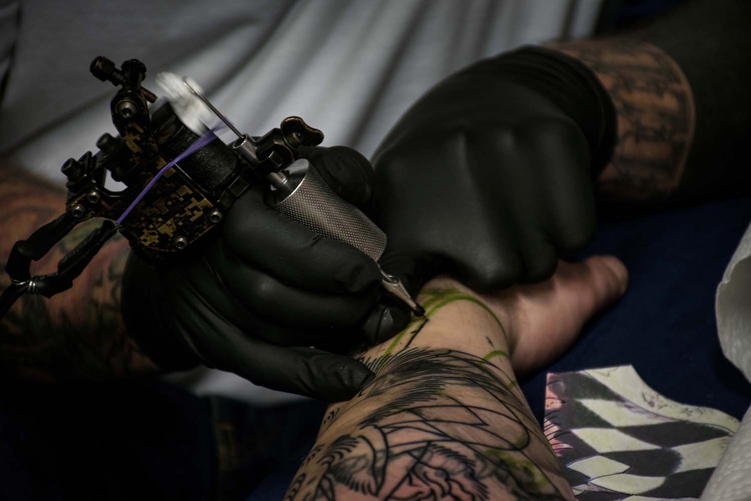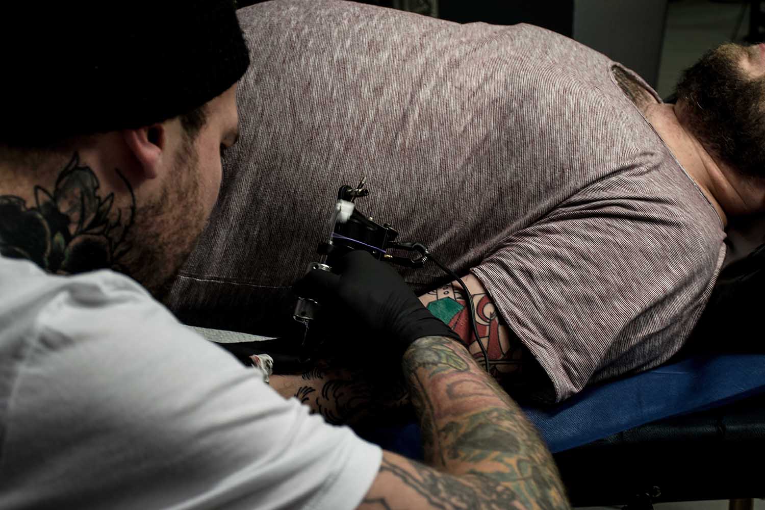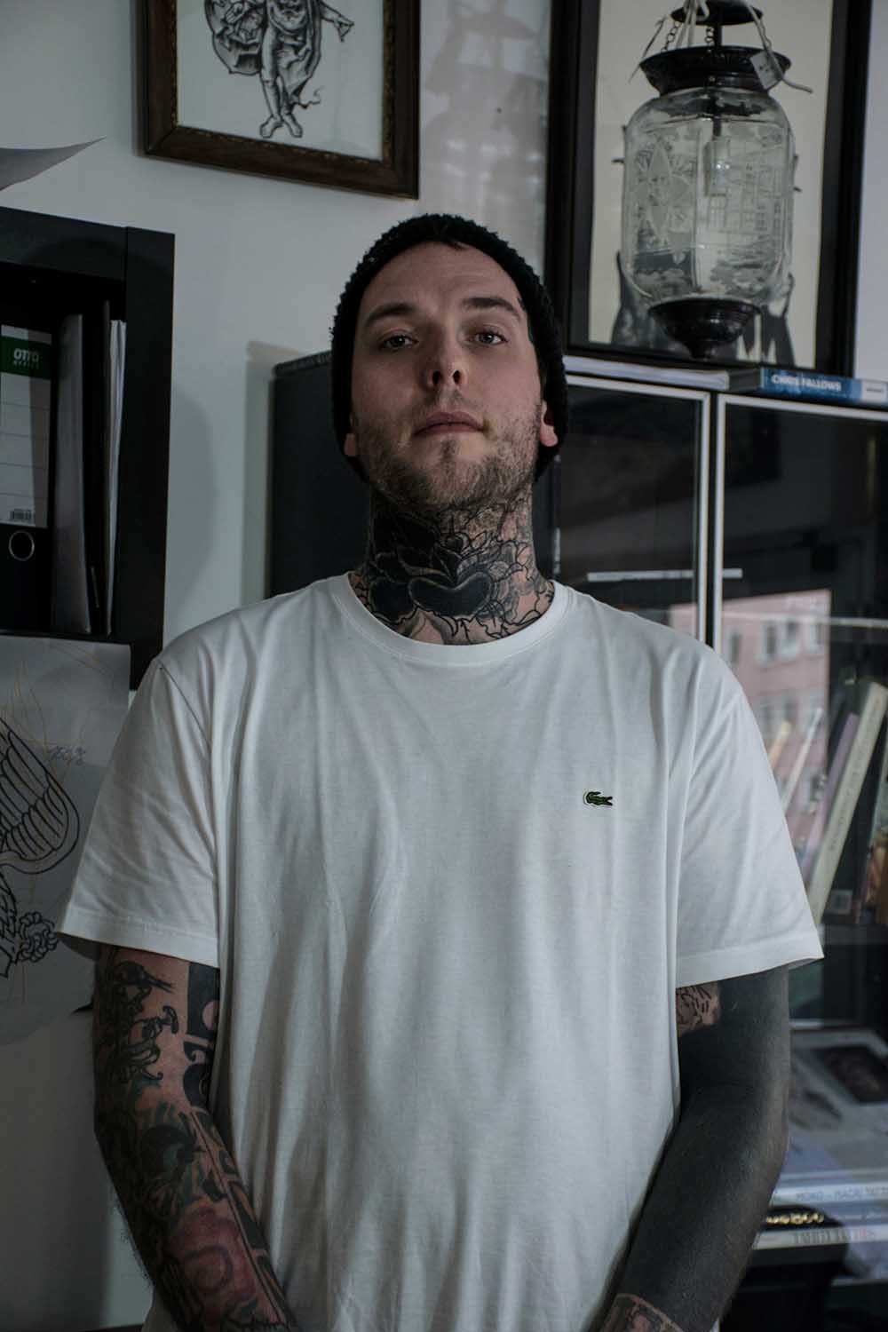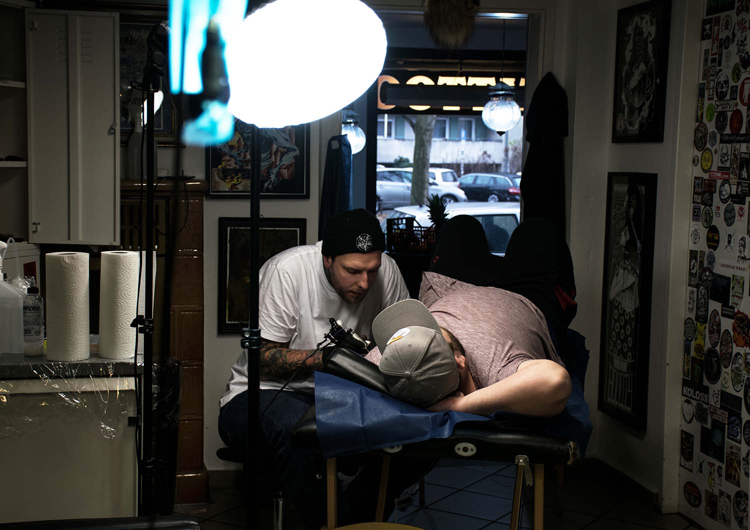 Bilder, die unter die Haut gehen und für die Ewigkeit sind. Der vielfältige Beruf des Tätowierers wurde in einer Aufgabe aus dem vierten Semester in Fotografien festgehalten. »Bounty« ist der Künstlername von Cris Benkert. Tätowierer, in Nürnberg, den ich bei seiner Arbeit, der Vorbereitung eines Tattoos und das Studio fotografisch festgehalten habe. Fertige Tätowierungen auf der Haut seiner Kunden habe ich ebenfalls abgelichtet. Die gesamte Semesteraufgabe habe ich in einem Buch festgehalten. Der Umfang beträgt ca. 50 Fotos.
