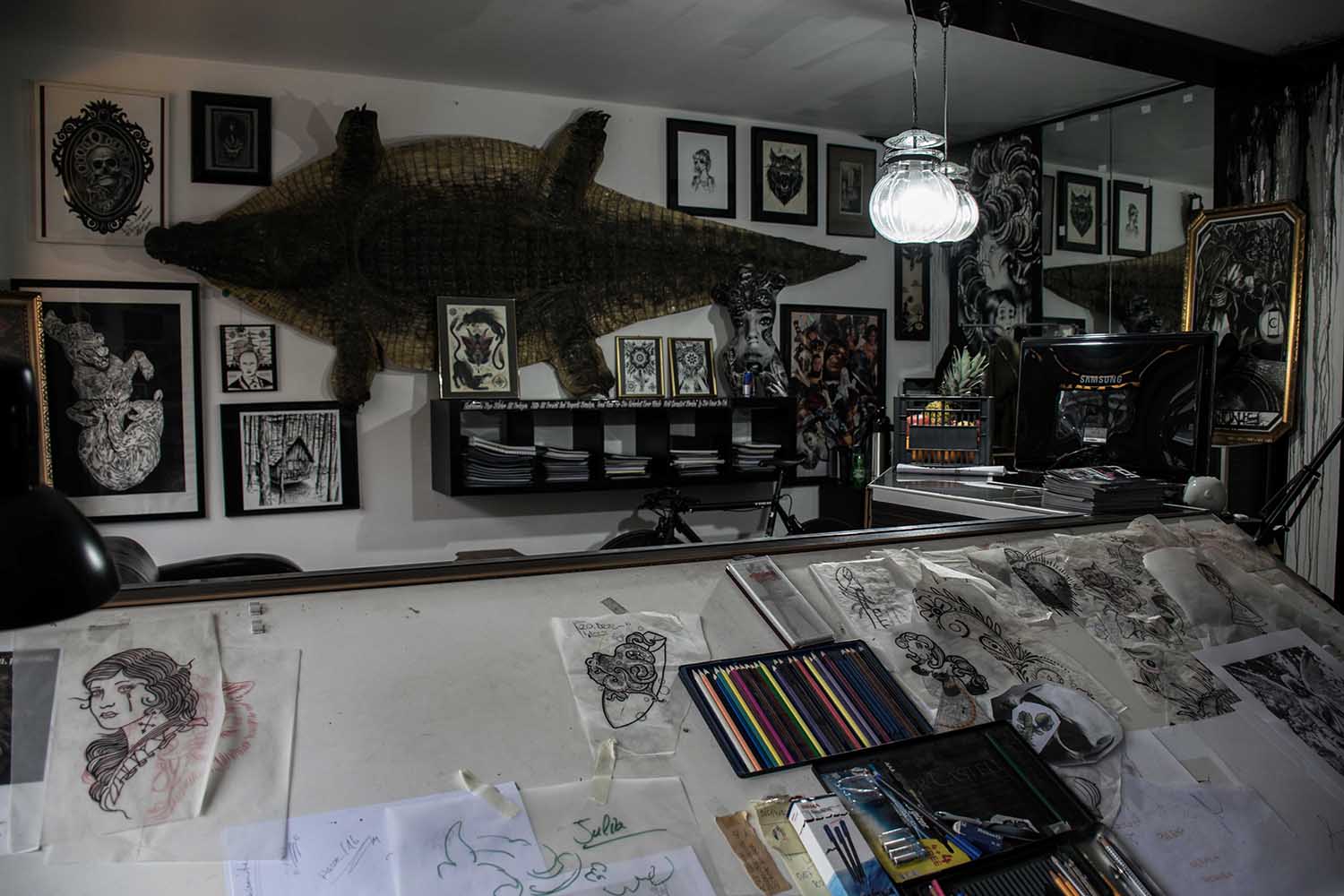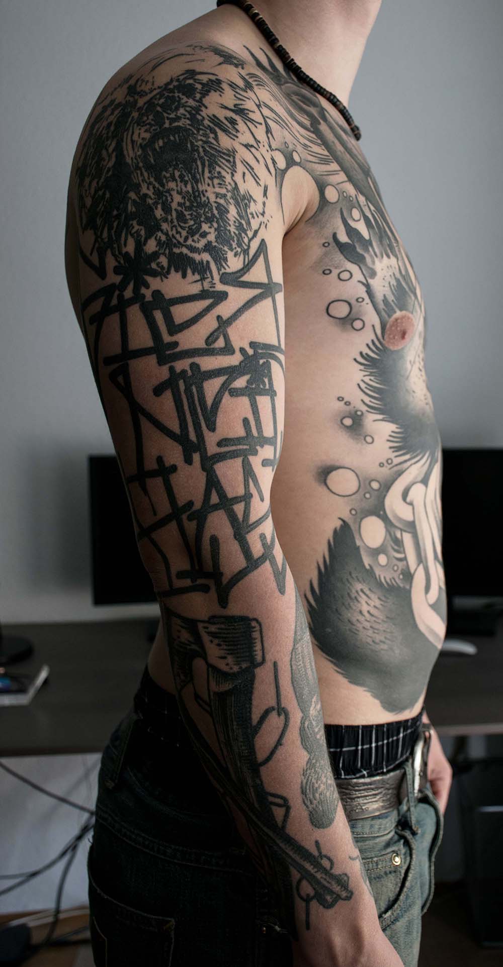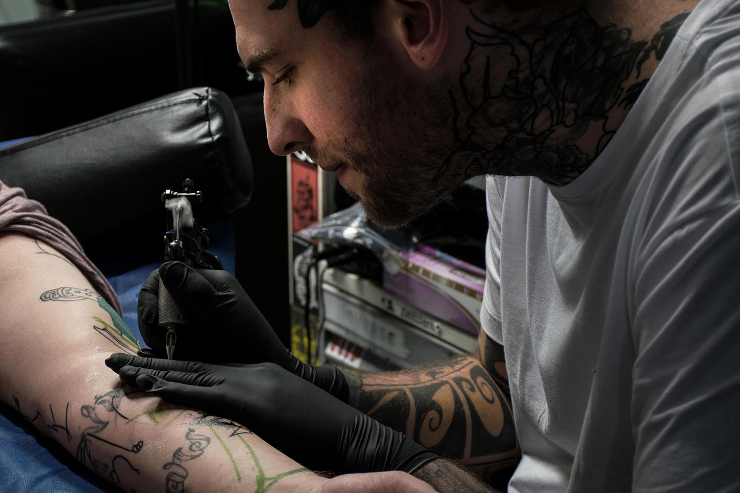 Bilder, die unter die Haut gehen und für die Ewigkeit sind. Der vielfältige Beruf des Tätowierers wurde in einer Aufgabe aus dem vierten Semester in Fotografien festgehalten. »Bounty« ist der Künstlername von Cris Benkert. Tätowierer, in Nürnberg, den ich bei seiner Arbeit, der Vorbereitung eines Tattoos und das Studio fotografisch festgehalten habe. Fertige Tätowierungen auf der Haut seiner Kunden habe ich ebenfalls abgelichtet. Die gesamte Semesteraufgabe habe ich in einem Buch festgehalten. Der Umfang beträgt ca. 50 Fotos.