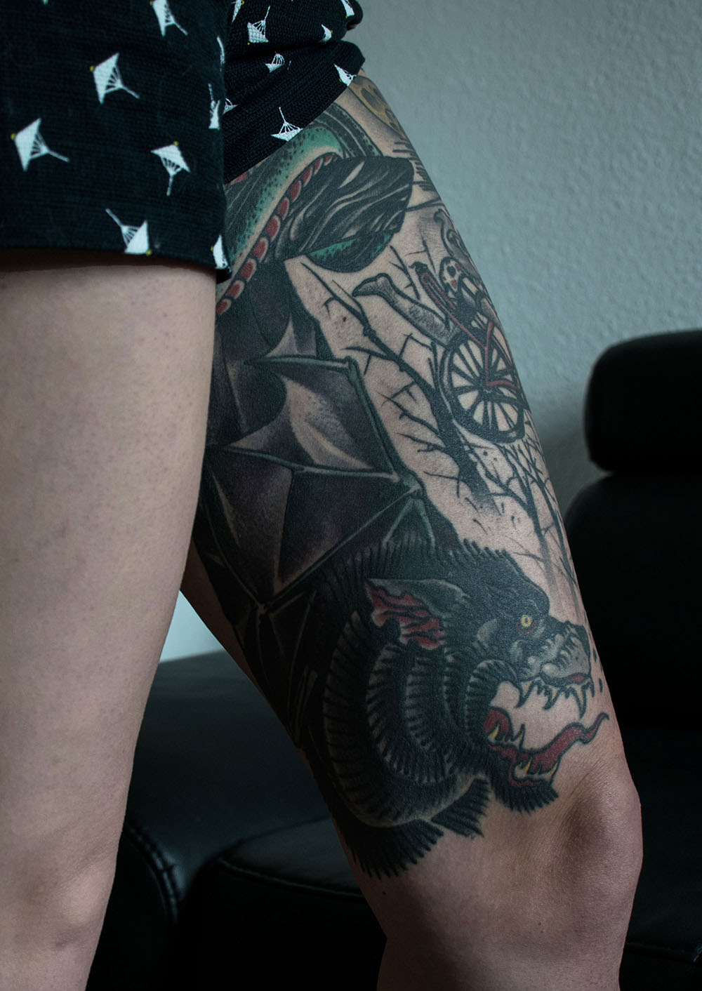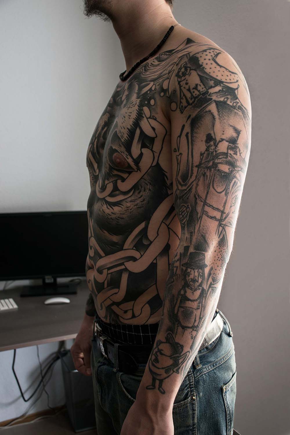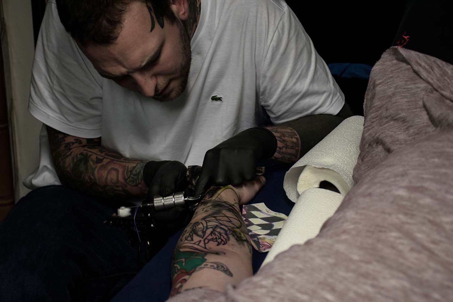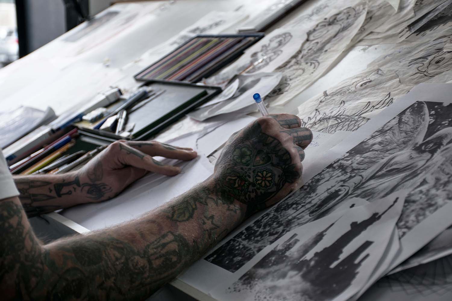 Bilder, die unter die Haut gehen und für die Ewigkeit sind. Der vielfältige Beruf des Tätowierers wurde in einer Aufgabe aus dem vierten Semester in Fotografien festgehalten. »Bounty« ist der Künstlername von Cris Benkert. Tätowierer, in Nürnberg, den ich bei seiner Arbeit, der Vorbereitung eines Tattoos und das Studio fotografisch festgehalten habe. Fertige Tätowierungen auf der Haut seiner Kunden habe ich ebenfalls abgelichtet. Die gesamte Semesteraufgabe habe ich in einem Buch festgehalten. Der Umfang beträgt ca. 50 Fotos.