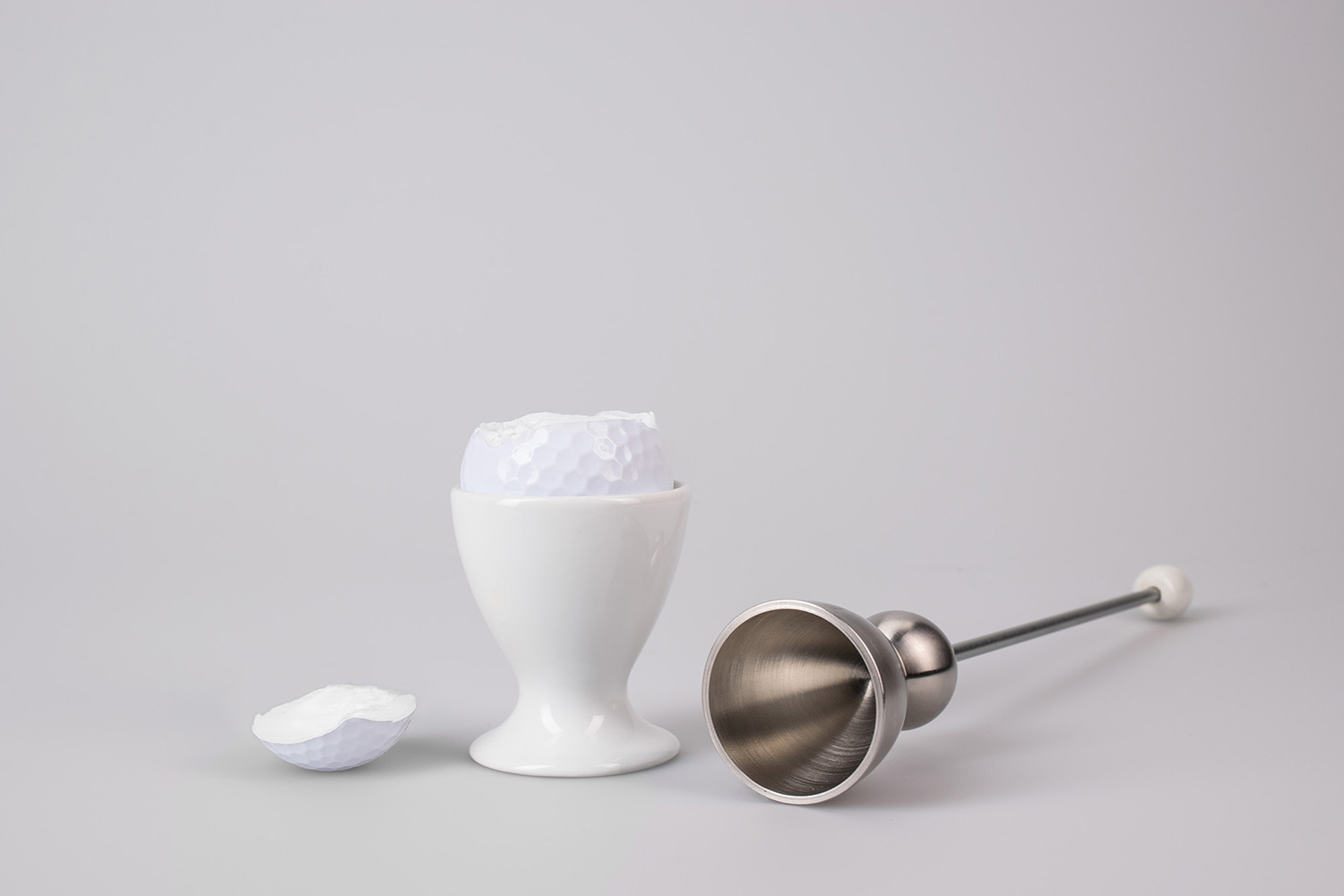 In seinen Aufnahmen werden oft Produkte mit etwas Surrealem kombiniert. In meinem Fall wurde ein Eiersollbruchstellenverursacher mit einem Golfball kombiniert, der das Ei ersetzt und von der Festigkeit her alles andere zerbrechlich ist.