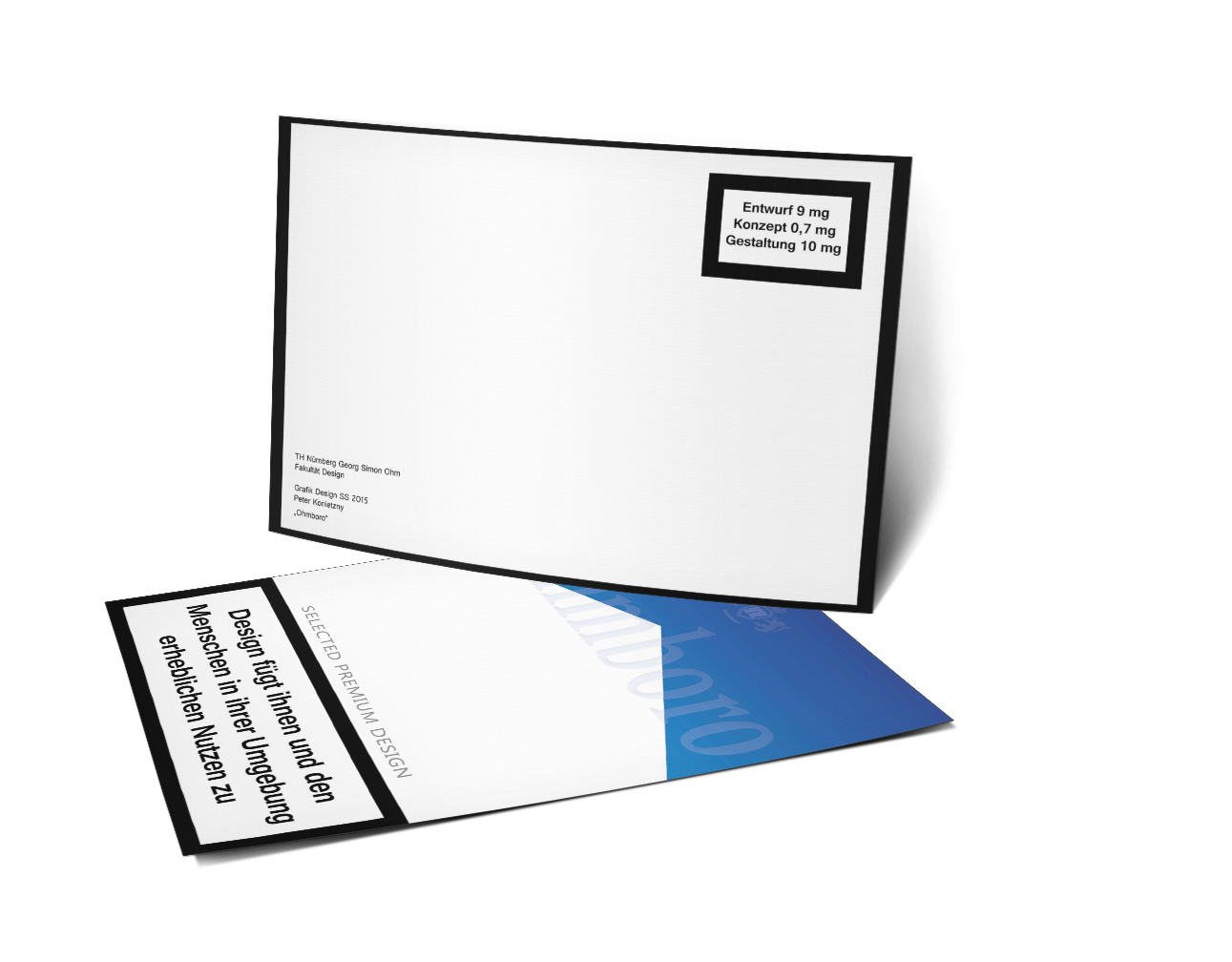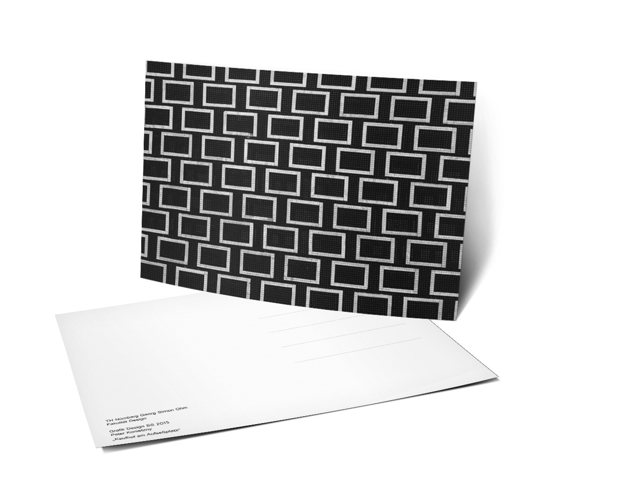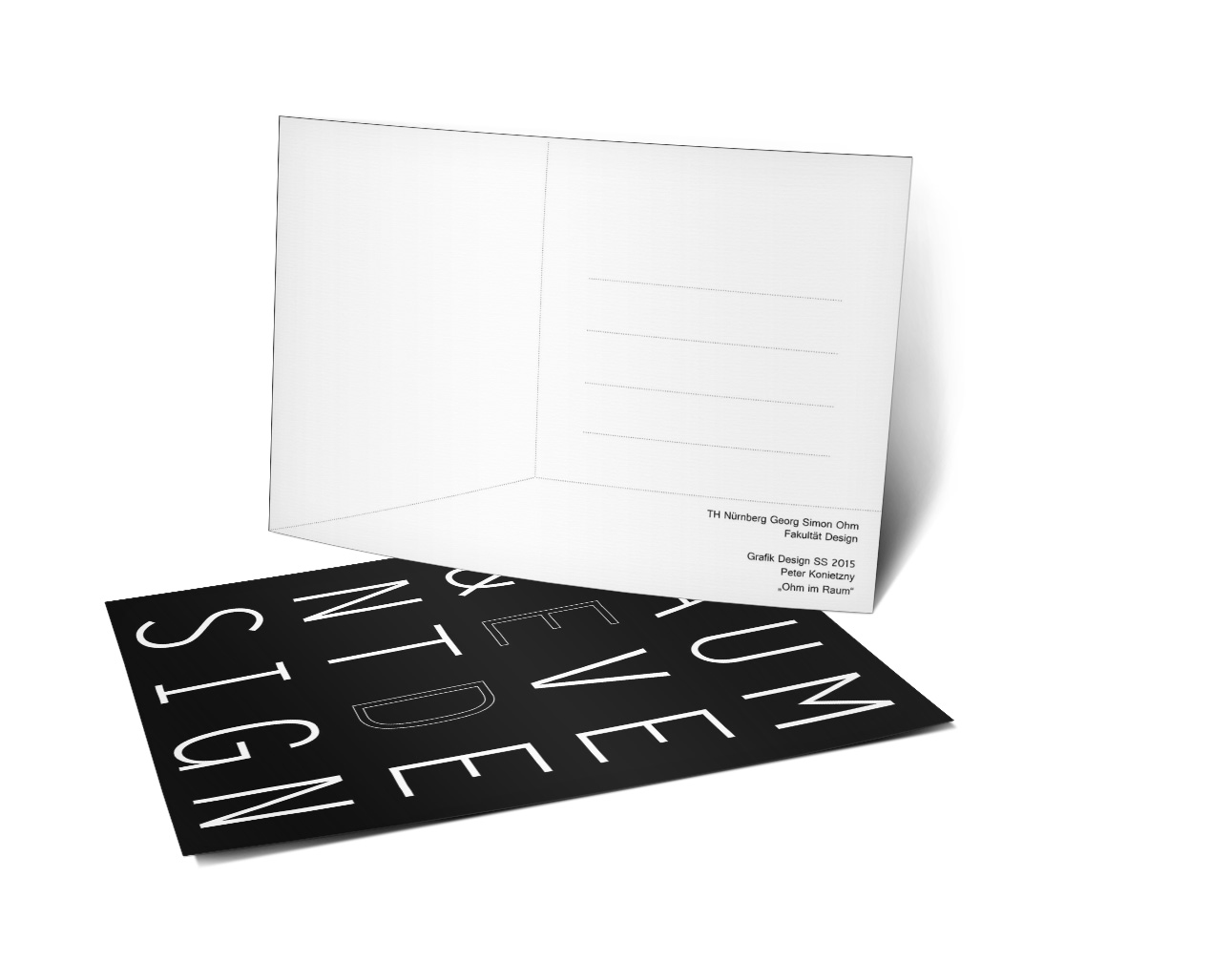 Bei »Fassaden und Räume« handelt es sich um eine dreiteilige Reihe von Postkarten, die sich auf drei verschiedene Module der TH-Ohm beziehen und die im ersten Semester entstanden sind. Neben zwei klassischen Karten für die Module Grafikdesign und Fotografie wurde auch eine Postkarte für das Modul Raum und Eventdesign gefertigt, die man zu einem dreidimensionalen Raum aufklappen kann.