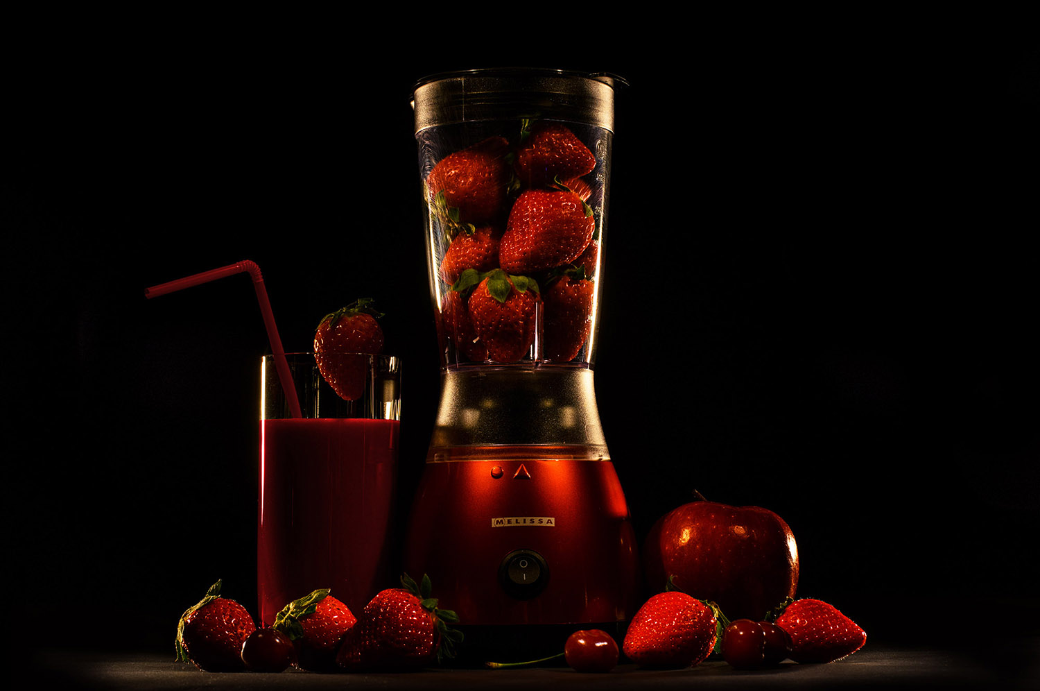 Ziel des Produktshootings aus dem dritten Semester war ein Produkt fotografisch so abzubilden, dass es in der Werbung eingesetzt werden kann. Zu sehen ist ein Smoothiemaker mit Obst.